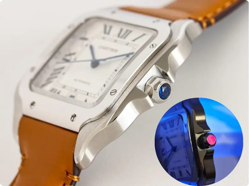 • Sapphire Cabochon Crown — Changes color subtly under UV light